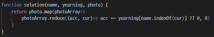 즉, 'yearning[name.indexOf(cur)] ?? 0' 구문은 photoArray 요소가 name 배열에 있다면 그 인덱스값을 yearning 배열에 대입해 값을 반환하고, 없다면 0을 반환해서 acc 에 더한다는 구문이 된다.