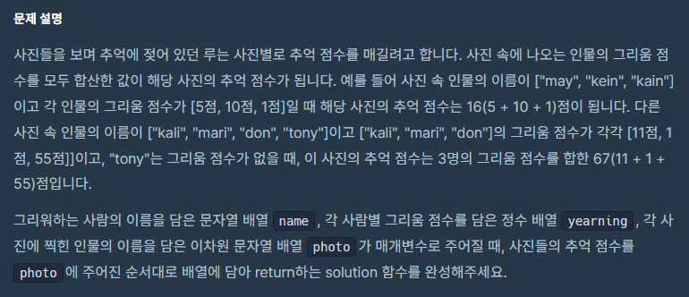 풀고자 했던 의도는 받은 2차원 photo 배열의 각 배열의 요소들이 name 배열의 요소와 일치하는지 확인, 일치한다면 해당 name 배열의 index값들을 가져와 yearning 배열에서 가져온 index들에 일치하는 값들의 합을 answer배열에 하나씩 대입하는 것이었다.