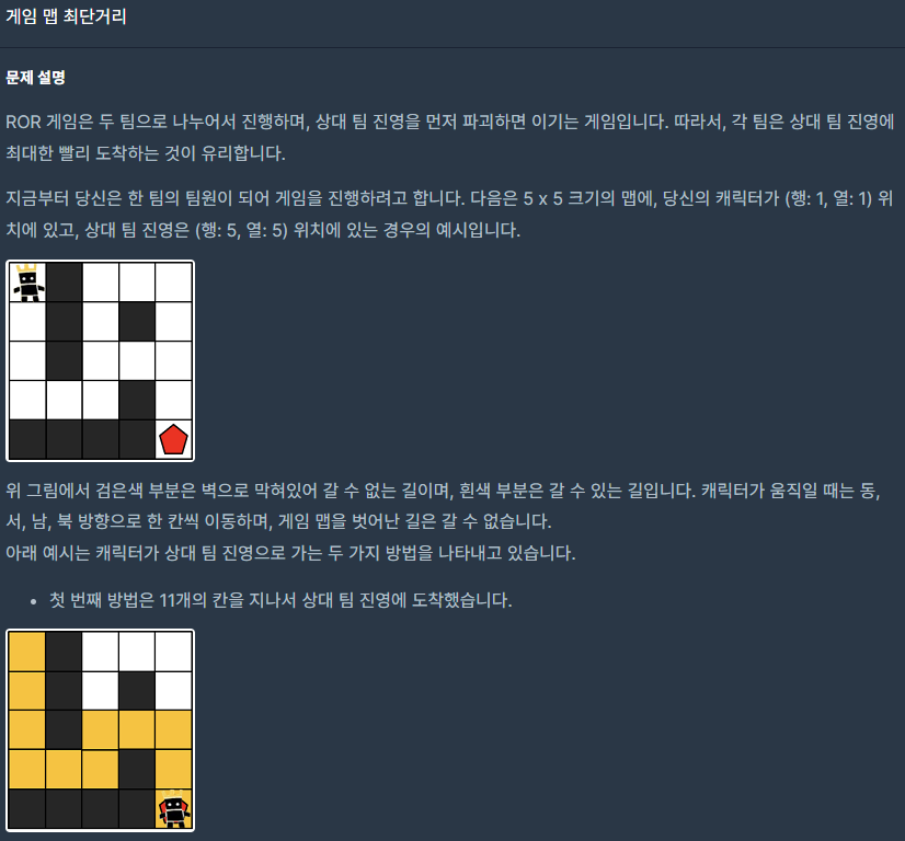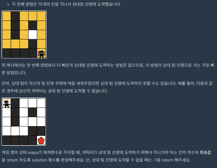 function solution(maps) { let xLength = maps[0].length; let yLength = maps.length; let xGoal = xLength-1; let yGoal = yLength-1; let queue = []; // queue의 초기값으로 y, x 값과 (0, 0)은 방문했기 때문에 리턴할 answer은 1로 둔다 queue.push([0, 0, 1]); while(queue.length) { // queue에 있는 요소 꺼내기 let [y, x, answer] = queue.shift(); // x값이 0보다 작거나 xLength보다 길다면 즉, maps에 없는 좌표면 while문 조건식으로 이동 if(x < 0 || x >= xLength) continue; // y값이 0보다 작거나 yLength보다 길다면 즉, maps에 없는 좌표면 while문 조건식으로 이동 if(y < 0 || y >= yLength) continue; // maps[y][x]값이 0이라면 즉, 갈 수 없는 길이라면 while문 조건식으로 이동 if(maps[y][x] === 0) continue; // x와 y값이 상대팀 진영에 도착했다면 answer 리턴 if(x === xGoal && y === yGoal) { return answer; } // 방문한 좌표 0으로 바꿈 maps[y][x] = 0; // queue에 현재 좌표의 상하좌우 각각의 좌표와 answer+1 푸쉬 queue.push([y+1, x, answer+1]); queue.push([y, x+1, answer+1]); queue.push([y-1, x, answer+1]); queue.push([y, x-1, answer+1]); } // while문이 끝났다면 갈 곳이 없다는 의미이므로 -1 리턴 return -1; }'Algorithm' 카테고리의 다른 글