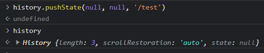 현재 세션 히스토리의 길이가 2라고 나와있고, 이제 다시 콘솔에 history.statePush를 해보자
