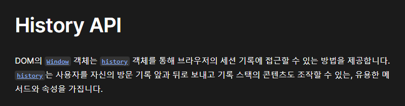 - history api를 이용하면 새로 고침을 일으키지 않고도 브라우저의 url을 바꿀 수 있는 Single Page Application을 만들 수 있다.
