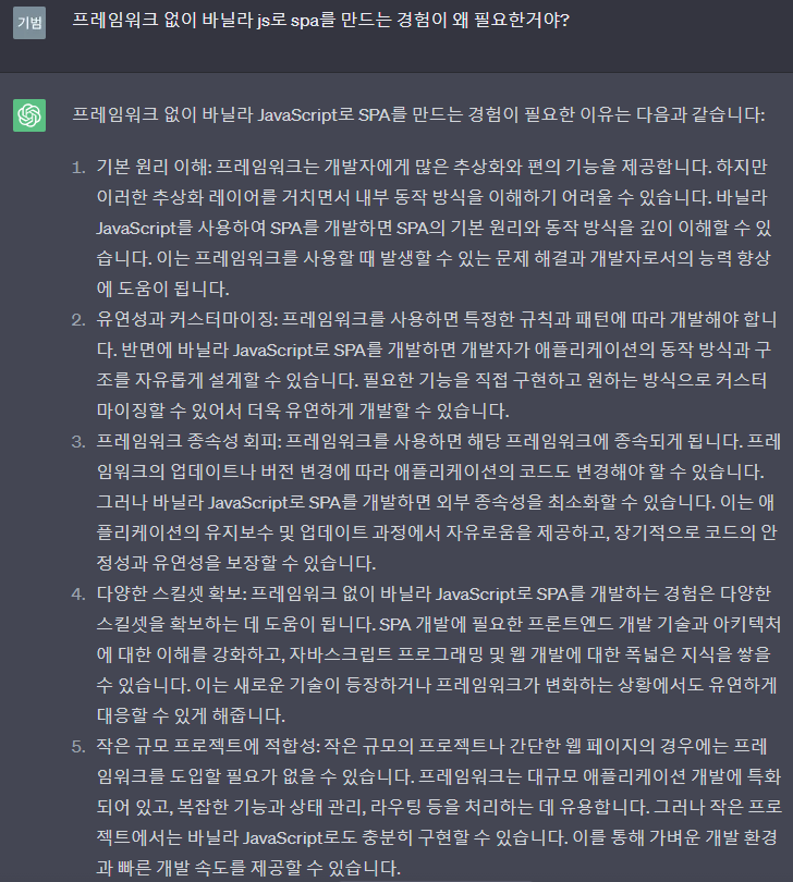 결국 또 다시 '꼭 Vanilla Js로 SPA를 만들어봐야 하는 이유가 따로 있을까?' 라는 궁금증을 직면하게 됐고, 검색을 해보았지만 원하는 대답을 얻을 수 없었기에 이번에는 chatGPT에게 물어보았다.