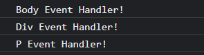 const $body = document.body; const $div = document.querySelector('div'); const $p = document.querySelector('p'); $body.addEventListener('click', () => { console.log('Body Event Handler!'); }, true) $div.addEventListener('click', () => { console.log('Div Event Handler!'); }, true) $p.addEventListener('click', () => { console.log('P Event Handler!'); }, true)