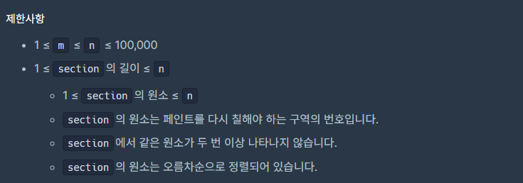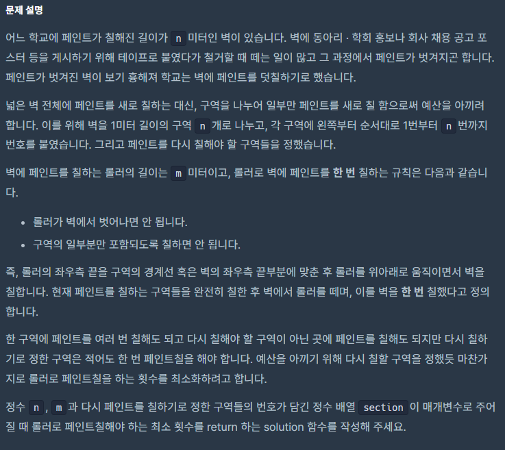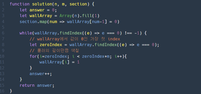 풀고자 했던 의도는 먼저 칠해진 벽은 1 칠해지지 않은 벽은 0으로 채워진 wallArray 배열을 만들고, wallArray 배열에서 칠해지지 않은 벽 즉, 값이 0인 가장 첫 index부터 index + 롤러의길이m -1 까지 모두 1을 대입해 벽을 칠한다. 이 과정을 wallArray에서 0이 없을 때 까지 반복한다.