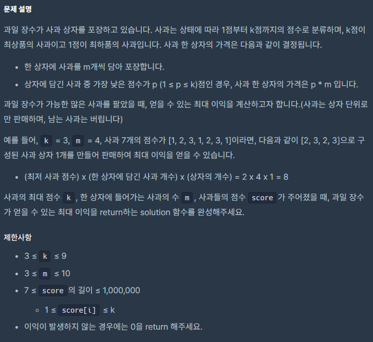 처음 풀고자 했던 의도는 score 배열을 내림차순으로 정렬한 뒤, 0번째 인덱스부터 m개씩 만큼 뽑아 최솟값을 구한뒤 m을 곱한 값들을 다 더하면 될 거라고 생각했다