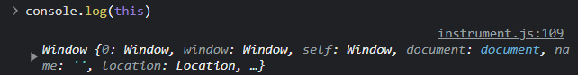 브라우저에서 this를 출력하면 Window 객체를 가리키는 모습을 볼 수 있다. 브라우저의 최상위 스코프는 Window인걸 알 수 있다.