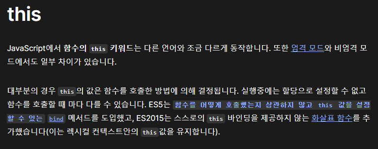 먼저 mdn 공식문서에서 this를 뭐라고 설명하는지 알아보자
